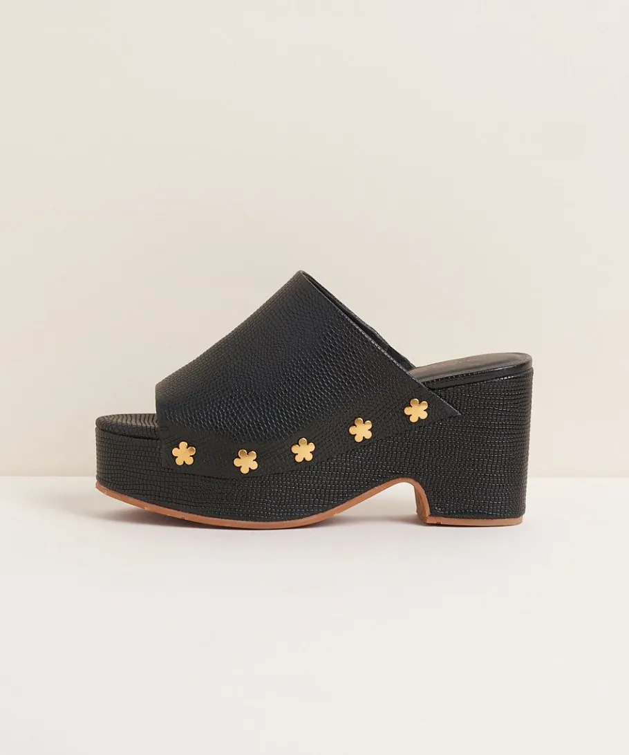 A Luxe Platform Mule With Floral Brass Stud Details. All Leather, Lightweight, 3.75″ Heel And 2″ Overall Platform Height. Voted Best Female Lead In A Drama Series And She Took Home The Gold (Studs)