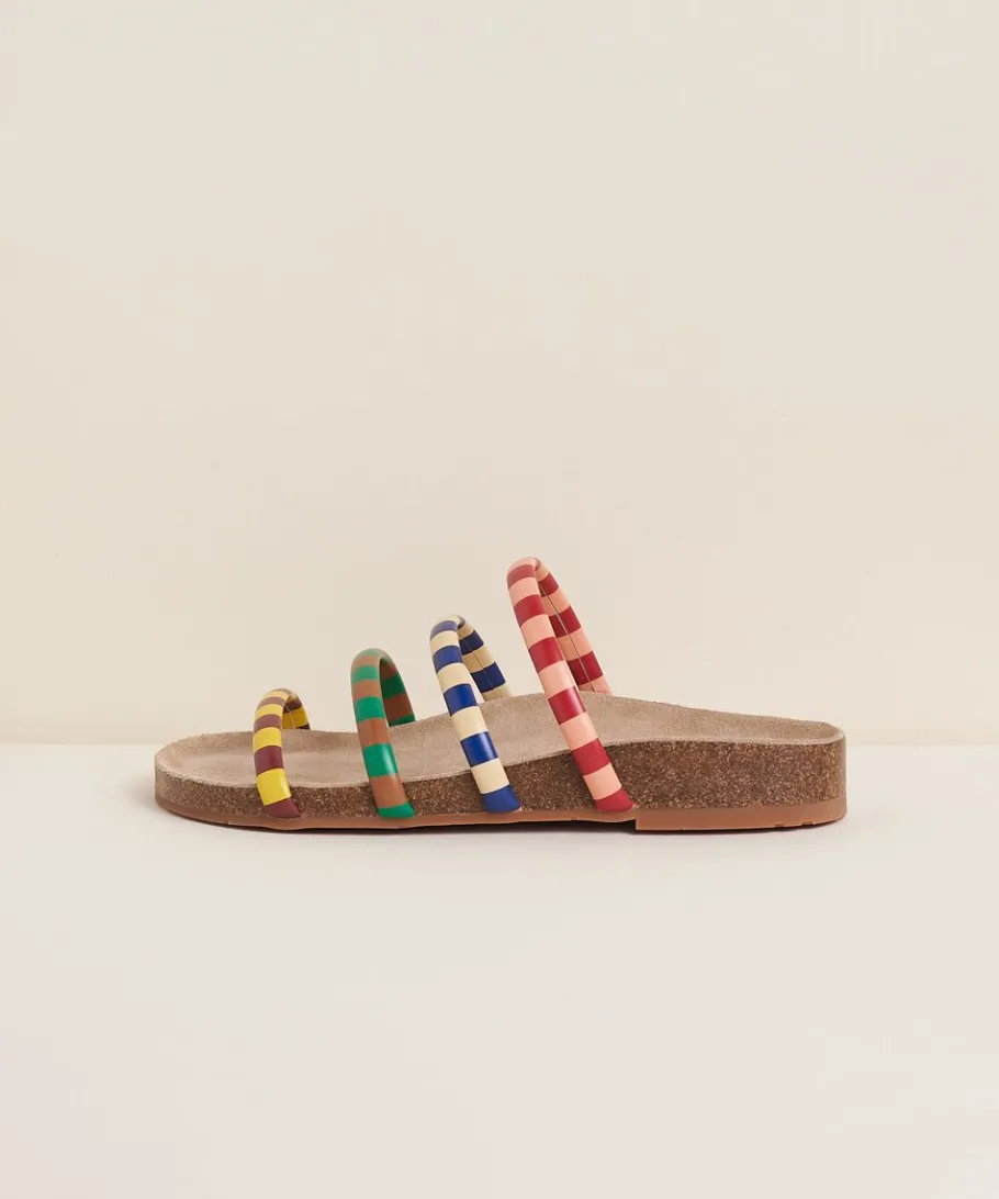 A Fan Favorite Classic Flat Sandal With Color. Cork And Memory Foam Footbed, Microsuede Sock, And Four Suede Or Leather Wrapped Upper Straps In Multi-Mismatch Solids And Stripes. Gloria, Hallelujah.