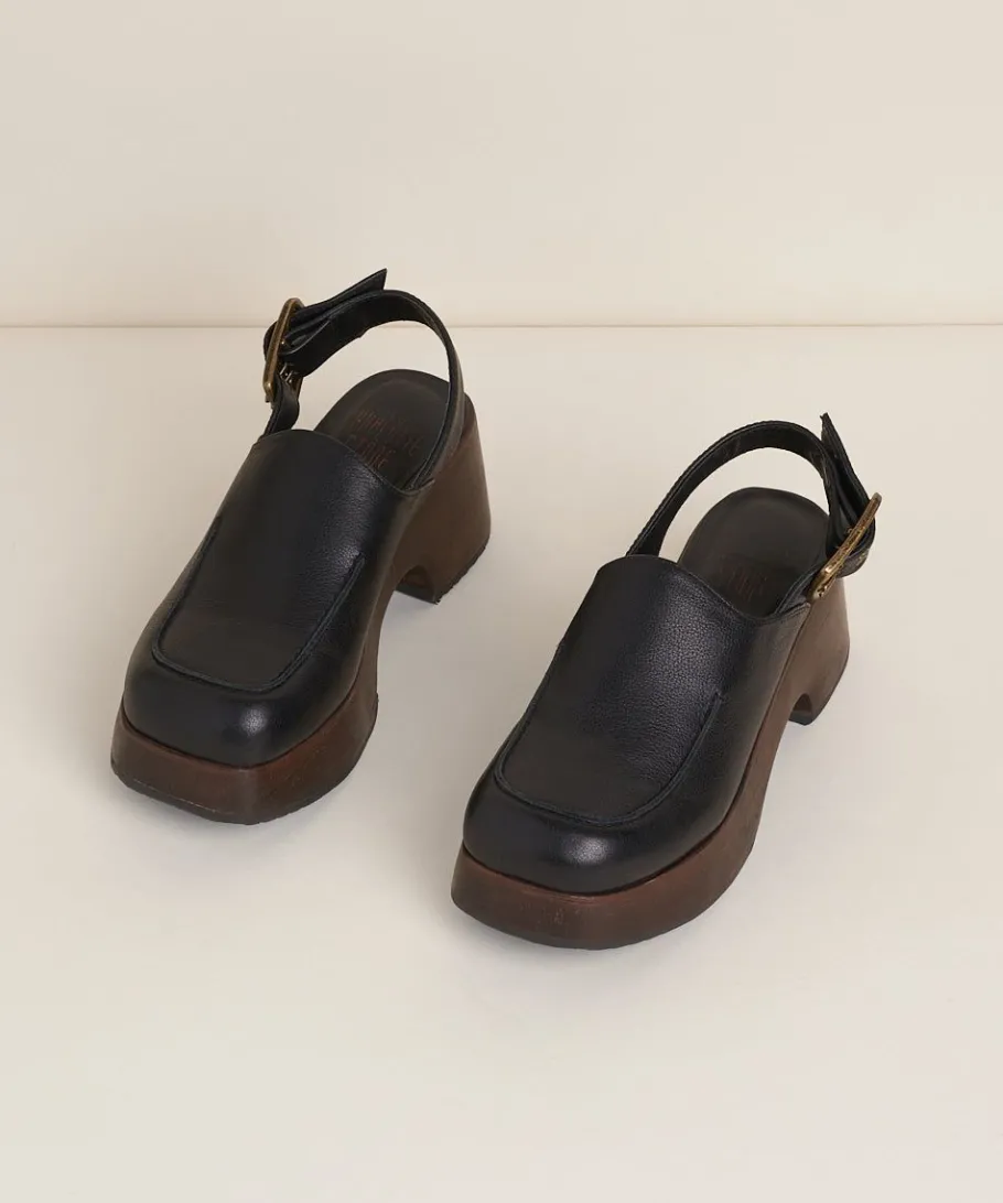 A 90’S Inspired Slingback Clog. Squarish Toe, Brass Buckle, 2.75″ Heel, And 1.25″ Platform. Supportive, Unique, And Wear-All-Day Comfortable.