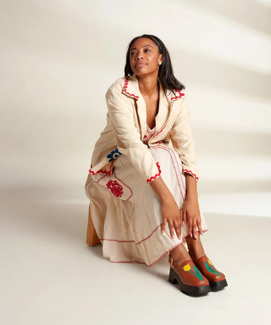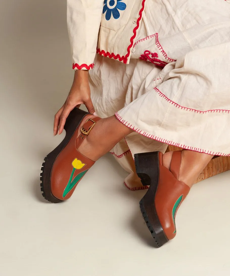 The Cs X Lorien Stern Collab Version Of Our Best-Selling Carlos Clog. All Of The Same Winning Features Of Carlos: 2.75″ Heel, And 1.25″ Platform, 90’S Style Squarish Toe, Leather Uppers, Slingback With An Oversize Buckle, Rubber Treaded Outsoles—Plus Lorien’S Classic Tulips In A Sweet Leather Cutout. She’S Retro And Current, Sweet And Salty, Cs And Ls.