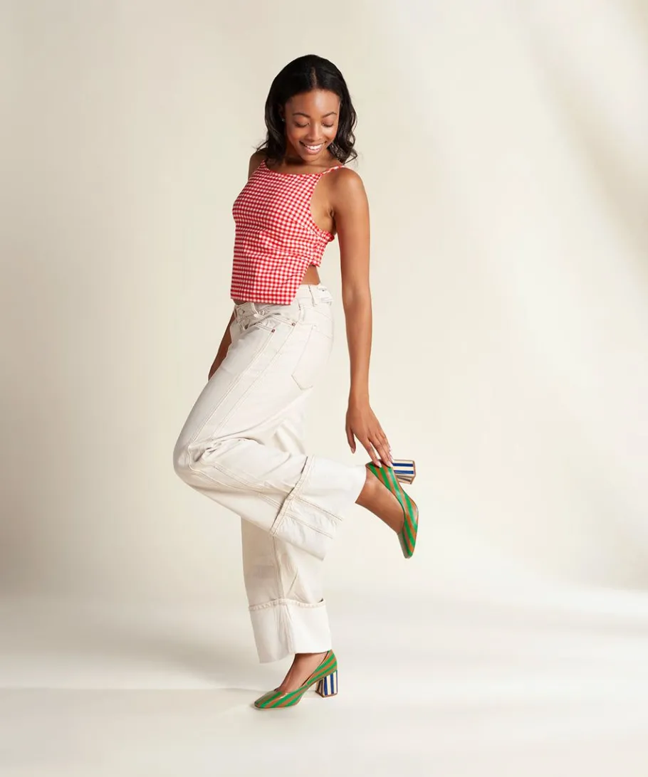 A Heritage Pump Style That Is Equal Parts Classy And Novelty. Multi-Mismatch Striped Leather Uppers With Contrasting Striped 2.75″ Block Heels, Squared Toe, And Dressy Buffed Leather Outsoles. With Stripes Like These You Know We Toe The Line Of Seriously Fun. 🙃